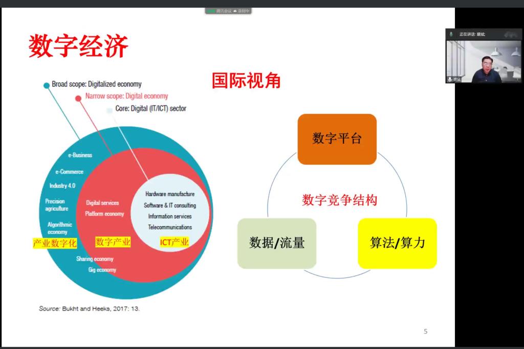 盛斌教授首先介绍了数字贸易研究框架涉及的五个问题:数字贸易的概念、数字贸易的特点、研究问题、数字贸易治理与数字贸易相关统计。基于数字贸易中大数据、人工智能和5G以及移动互联网技术等底层数字技术,盛斌教授从国际视角介绍了数字竞争结构中的数字平台、数据与流量以及算法算力,也从中国视角详细解读了中国数字经济涵盖的数字产业化、产业数字化、数据价值话以及数字化治理四个方面。