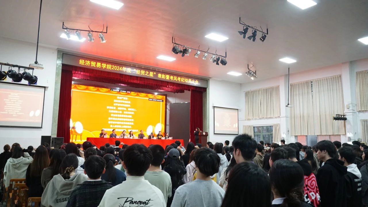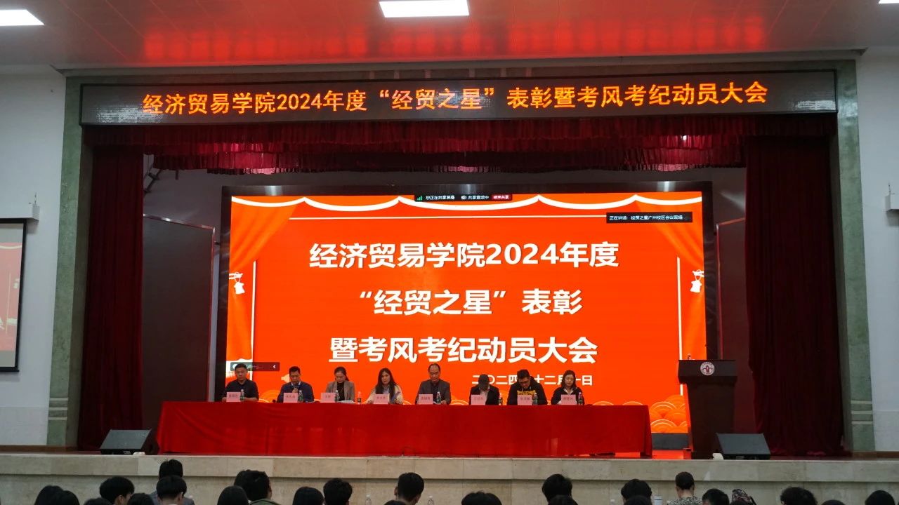 12月10日下午,十大买球的正规网站2024年度“经贸之星”表彰暨考风考纪动员大会在校本部大礼堂召开。学院党政领导班子全体成员、各年级辅导员、班主任及校本部22级、24级专升本全体学生参加了此次大会。
