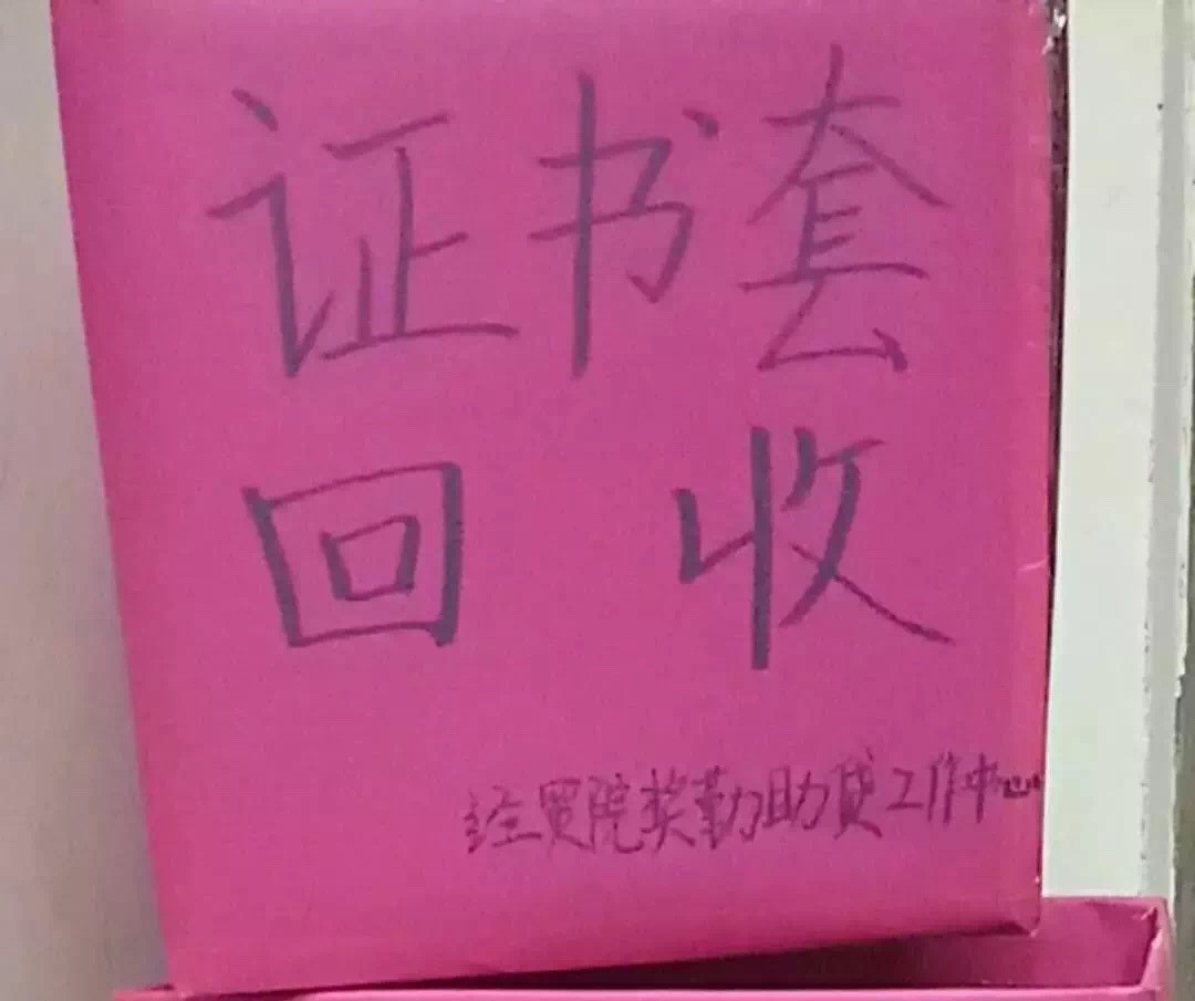 4月19日,相关工作组于当天19点在各个宿舍点放置回收箱,同时另一组工作组每两天即回收一次证书套,并且提供上门回收服务。这为有意愿进行捐赠活动的师兄师姐提供了极大的便利。