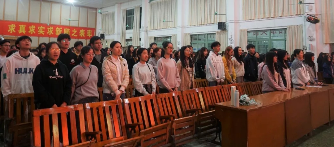 在大会正式开始前,全体领导、老师和同学们整齐起立,激情澎湃地歌唱国歌。