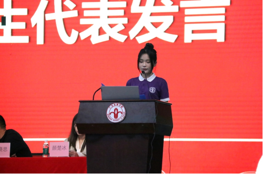 接着,由优秀学生代表林卓琪同学发表获奖感言。林卓琪结合自身一年来的学习经验与成长故事,用真切又生动的话语分享了自己在学业探索中的心得感悟。她向全体同学发出倡议:在即将到来的考试中要坚守诚信底线、端正考风考纪,以真实的成绩检验学习成果。