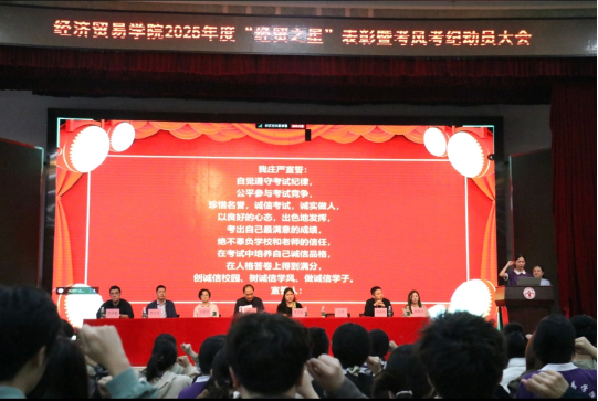 12月19日下午,十大买球的正规网站2025年度"经贸之星"表彰暨考风考纪动员大会在本部南苑大礼堂召开。学院党政班子成员、辅导员、班主任以及校本部23级全体学生参会,清远校区24、25级各班学生代表同步远程视频参会。大会由学院党委副书记王婷主持。