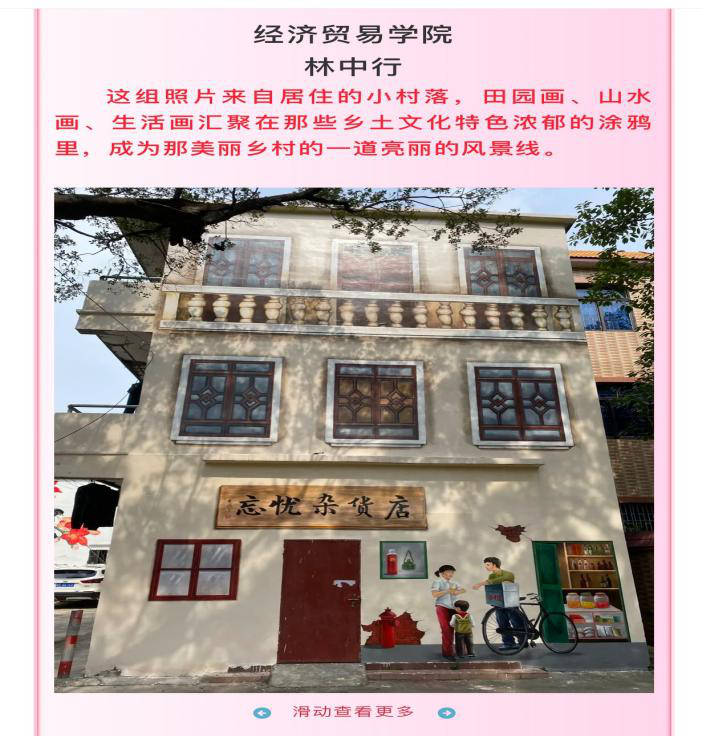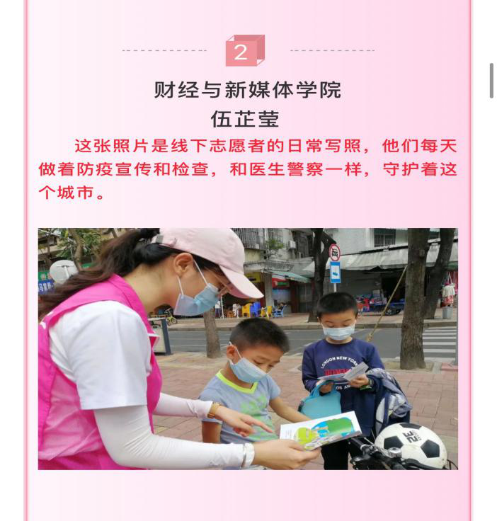 摄影大赛向全体师生征集“擦亮时光镜头,共织时代记忆”为主题的照片及其背后的故事,摄影大赛分两个主题:主题一,寻找身边关于党的红色基因,可从建设历程、丰功伟业、人文关怀等方面直接或间接映射出我党的内蕴。主题二,突如其来的疫情,带给了我们太多的改变,观察到自己身边有哪些变化,用一张或一组照片记录下来,然后通过投票以及工作人员评分的综合方式评选出极具意义的作品向全体师生展示。参加此次“擦亮时光镜头,共织时代记忆”摄影大赛的学生有两百多人,通过投票综合评选选出20份优秀的作品,其中14位同学荣获优秀奖,有陈芝琦、陈彩幻、李嘉欣、李婷婷、邹夏苗、杜倩滢、伍芷莹、郭斯泽、刘彦东、李丹蕾、魏琳、刘卜溢、黄钰清,梁翠莹同学,彭晓琴、周绮晴、林子欣同学荣获三等奖,曾子毅、陈美雅同学荣获二等奖,林中行同学荣获一等奖。