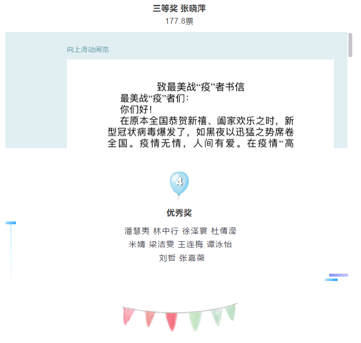 本次活动一开始由宣传部在4月26日发布活动推文通知,从4月27日起到5月3日由各班级团支书统一收集作品,5月4号到7号由各部门评委代表进行第一次评分,最终评分筛选出了13份优秀作品进行线上师生投票,经过5月8号到10号为期三天的线上投票角逐,最后的投票结果和获奖情况是:一等奖得主为何栩乐同学,张琳同学和张晓萍同学分别荣获二等奖和三等奖,荣获优秀奖的10名同学有潘慧夷同学、林中行同学、徐泽寰同学、杜倩滢同学、米婧同学、梁洁雯同学、王连梅同学、谭泳怡同学、刘哲同学和张嘉薇同学。