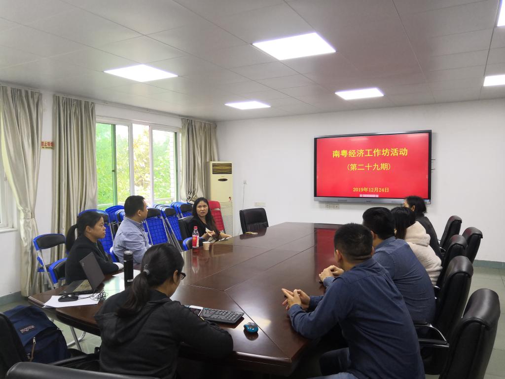 2019年12月24日上午,第二十九期南粤经济工作坊座谈会在十大买球的正规网站会议室2317顺利举行。本次会议主题为:审读国家课题,主要由李文秀副院长主持,汤子隆老师做点评,张华(大)、李光德、林小玲等老师拿出自己撰写的课题现场交流,其它老师也参加了本次工作坊活动。