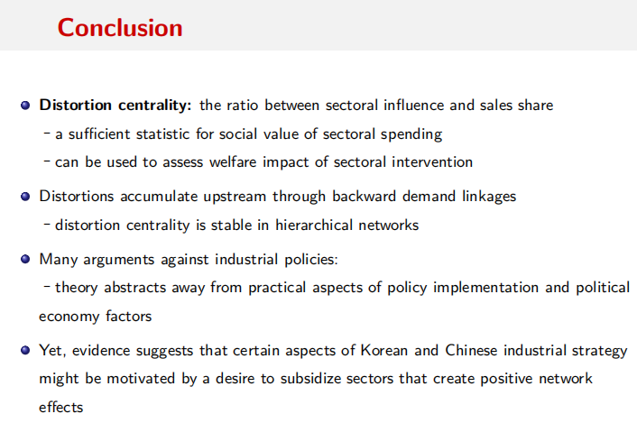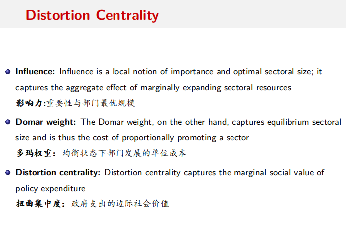 论文重点考察以下三个问题:第一,扭曲效应存在产业间投入产出关系,因此补贴扭曲最大的部门可能无济于事,制定政策需要综合考虑网络效应;第二,投入产出结构并非一成不变,因此政策干预需对结构假定具有敏感性;第三,政策规定依赖于市场扭曲的严重程度,因此论文提出了“扭曲集中度(Distortion Centrality)”概念,该测度方法整合了生产网络中市场缺陷的扭曲效应。文中,“扭曲集中度”则是部门影响力与多玛权重(Domar weight)之间的比率。影响力表征最优规模下部门重要性;Domar weight则捕获均衡状态下的部门规模,即表征为促进部门发展所耗费的单位成本。