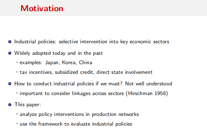 该论文的研究背景:许多发展中国家采取有利于部门发展的产业政策。这种干预是否存在经济逻辑?选择性产业政策的实施对企业绩效存在较强的不确定性,且研究结论莫衷一是。论文研究方式是通过投入产出关系构建出生产网络关系分析经济部门的产业政策。研究发现:第一,政府对上游部门的补贴具有较强的刺激性;二是市场缺陷通过后项需求关联加剧扭曲效应,导致上游部门萎缩,扭曲扩张;三是1970年代韩国与当代中国的产业政策表明部门干预对经济发展起到重要促进作用。